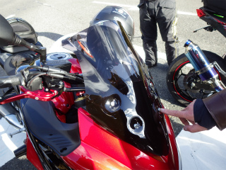 6.吉備湯浅PA AM9:50 ココで和歌タケさんコーナー。ハイスクリーンを装着。海外製品を取り寄せられたらしい。ビスがシルバーなので近々黒に塗装されるらしい。 |