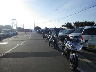 4.中島PA 3 中島PAにはゼブラゾーンが無いので縦に並んでの出発ショットとなる。いくら晴天でもこの時期は寒いので皆さんに完全武装をお願いした。 |