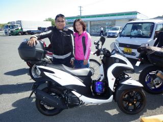 3.ファミマ泉南インター 3 JOHJIさん夫妻がお見送りに来て下さった。何とよく見れば・・・!!マシンが変わっている。お披露目となったTRICITY155。良いなぁ〜〜 |