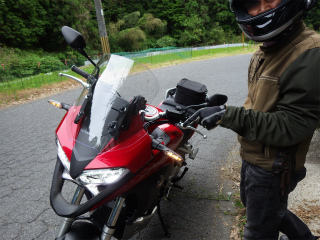 2.ファミマ泉南インター 2 のりのりさんのお披露目でマシンはCD250。4月定例ツー時に、お見送りで見せていただいていたのだが、ツー参加はお初となる。 |